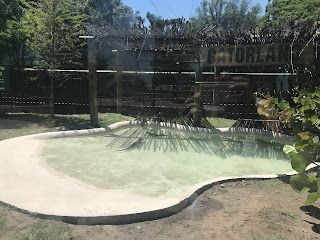 Na ongeveer een half uur rijden komen we aan bij een meer. We lopen wat rond in het parkje met een bassin met kleine alligators en een Indiaans dorpje.
